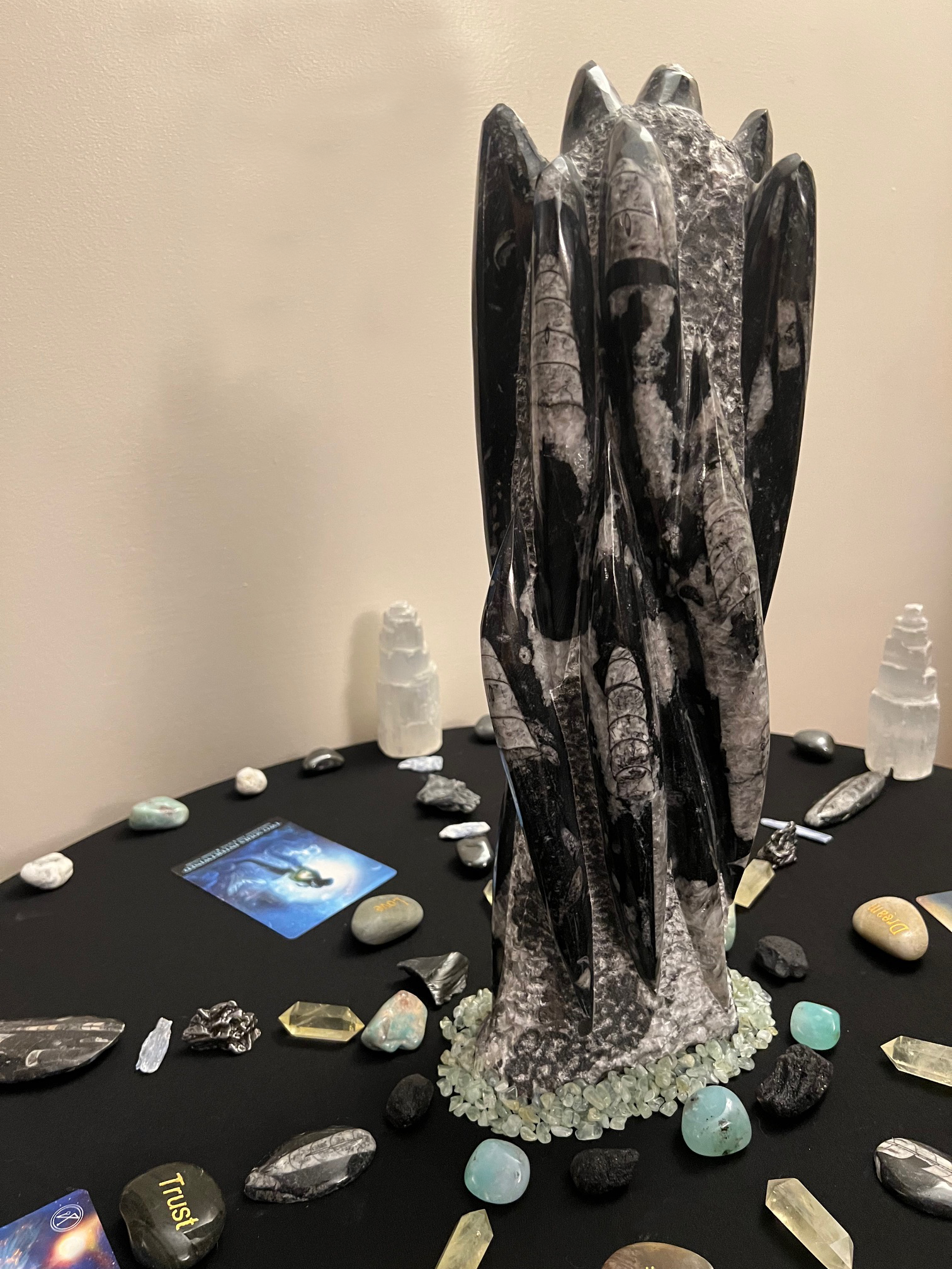 I was called to bring home a unique piece: an Orthoceras fossil, an ancient ocean creature (over 400 million years old!) preserved in limestone. As soon as I saw it, I knew it belonged with me and would be part of our upcoming Crystal Grid Workshop. It feels like it carries the wisdom of the ancient oceans, ready to share healing and deep connection.